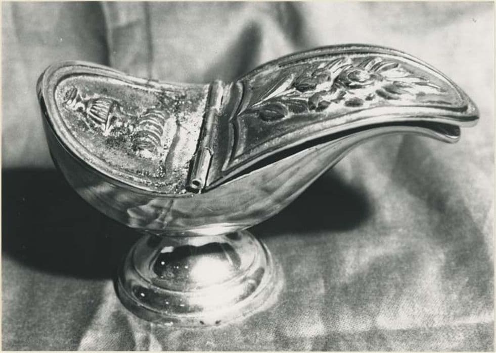 Pied circulaire, la navette proprement dite a ses flancs entièrement ornés d'une frise de godrons. Le couvercle ne possède pas de décor.