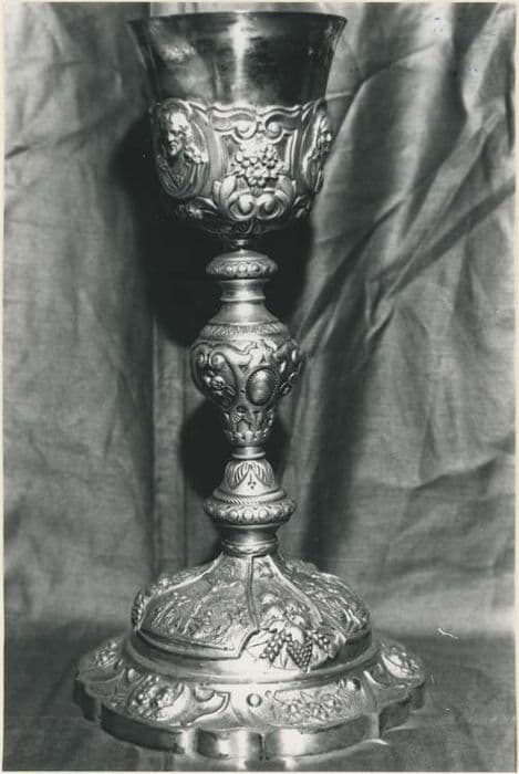 Large pied circulaire à bords chantournés et décor en relief : angelots, fleurs, symboles de l'Eucharistie (grappes de raisin, épis de blé) entourant des scènes religieuses. Noeud en balustre décoré de médaillons et de réserves renfermant des fruits. Coupe décorée de cartouches à fleurs alternant avec des effigies en relief plus accentué.