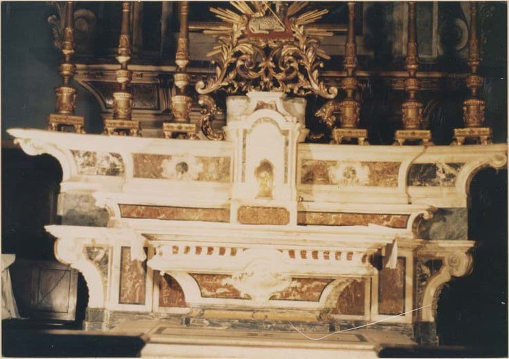 Maître-autel et son retable, marbres et gypseries polychromes et dorées. Grand autel à table-tombeau surmonté de trois degrés dont les bords sont ornés de consoles avec angelots en relief. Le tabernacle a été remanié au 19e siècle et percé d'une porte à arc brisé.