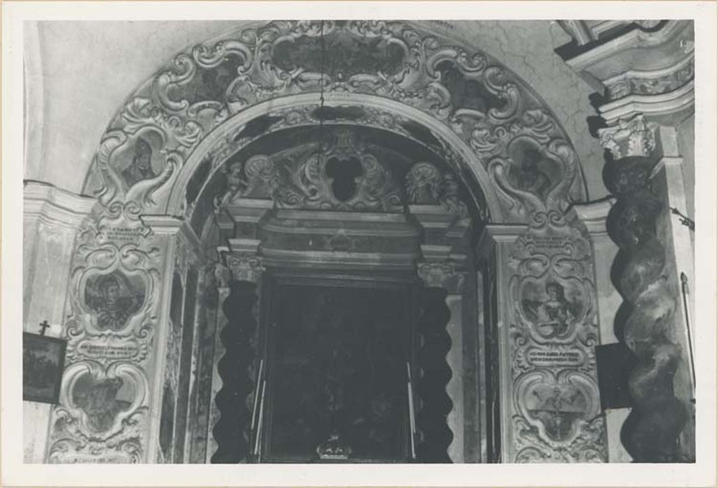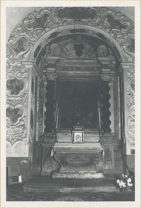 Autel et retable de la chapelle du Purgatoire, gypseries polychromes et sa toile. Le retable des Ames du Purgatoire occupe le fond de la chapelle latérale dont il surmonte l'autel tombeau, décoré d'un cartouche peint. Il se compose de deux colonnes torses (faux-marbre noir) et d'un entablement curviligne décoré de deux anagrammes mortuaires. Le fronton à volutes et le cartouche central sont ornés de coquilles, palmes, angelots, guirlandes, etc... Au centre la toile représente saint Roch (ou saint Jacques pélerin ?) et saint Jean-Baptiste, intercédant auprès de la Vierge à l'Enfant pour les Ames du Purgatoire. L'extrados et l'intrados de l'arc de la chapelle et des piédroits qui le supportent sont décorés : dix-huit médaillons et six cartouches de gypserie.