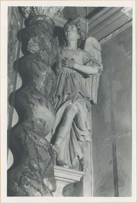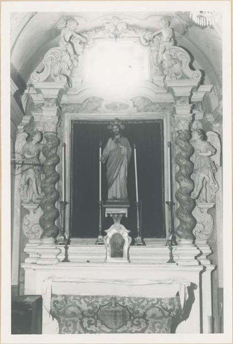 Gypseries polychromes. Autel à tombeau décoré de peintures (rinceaux et médaillon central) surmonté d'un retable à colonnes torses (faux-marbre ocre veiné de bistre) flanqué de deux statuettes d'anges. L'entablement et le fronton à volutes surmontés d'anges et d'acanthes servent d'encadrement à la lucarne qui éclaire cette chapelle. Le tableau manque.