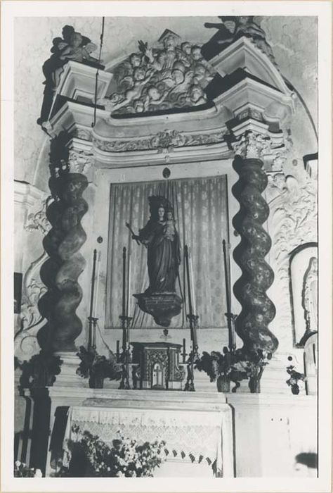 Autel et retable du Rosaire, gypseries polychromes, bois sculpté et doré, et sa toile, Institution et mystère du Rosaire, huile sur toile. Retable à deux colonnes tores avec entablement et fronton brisé curviligne, constituant une sorte de niche. Des gypseries (motifs végétaux, Père éternel dans un gloire de nuages avec angelots) décorent les parois du mur avoisinant le retable (respectivement de part et d'autre des colonnes et dans l'espace frontal). Tabernacle à colonnes torses : motifs décoratifs dorés sur fond ivoire.