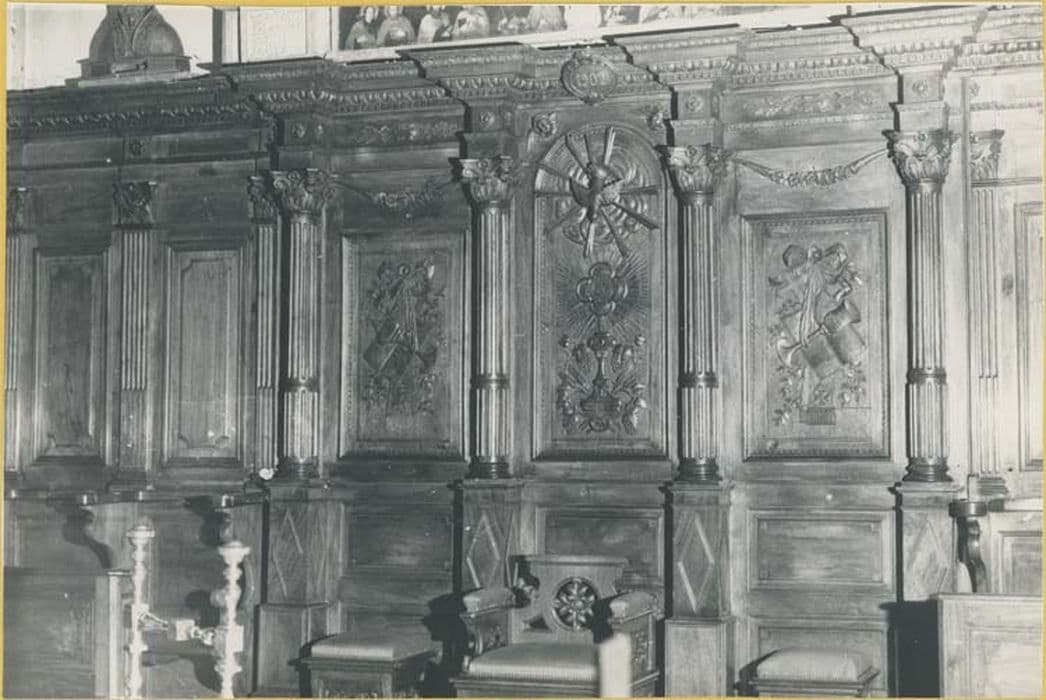 Stalles à lambris rythmés par des pilastres cannelés à chapiteaux corinthiens. Les stalles principales ont un dossier orné de sculptures en bas-relief.