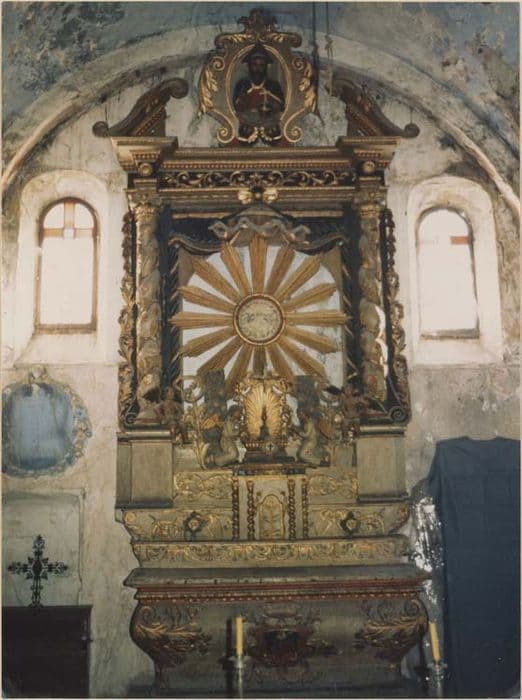 Autel tombeau décoré de feuilles d'acanthes aux angles et d'un cartouche central armorié. Il est surmonté de trois gradins ornés de rinceaux en frises, entourant un tabernacle à façade décorée de quatre colonnes torsadées. Le retable est à deux colonnes torses rehaussées de pampres et de grappes, supportant un entablement à frise de rinceaux et un fronton à volutes. Le cartouche frontal est orné d'un Père Eternel, en relief et en buste. Au centre du retable, le symbole rayonnant de l'Esprit Saint. Le tabernacle est surmonté d'une exposition (coquille tenue par deux anges).