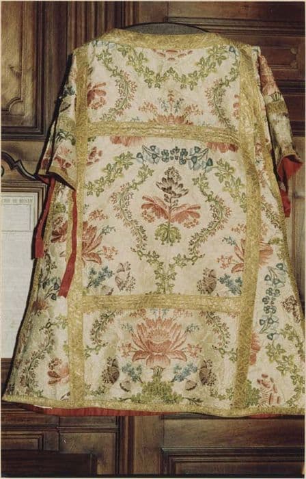 Ornement : une chasuble, une dalmatique avec voile (rideau) assorti pour le tabernacle. Broché de soie surbrodé, fleurs et ramages polychromes sur fond ivoire. Motifs végétaux stylisés (motif central cruciforme et guirlandes) rehaussés de grosses fleurs roses (pivoines) et de petites fleurs bistres, roses et bleues.