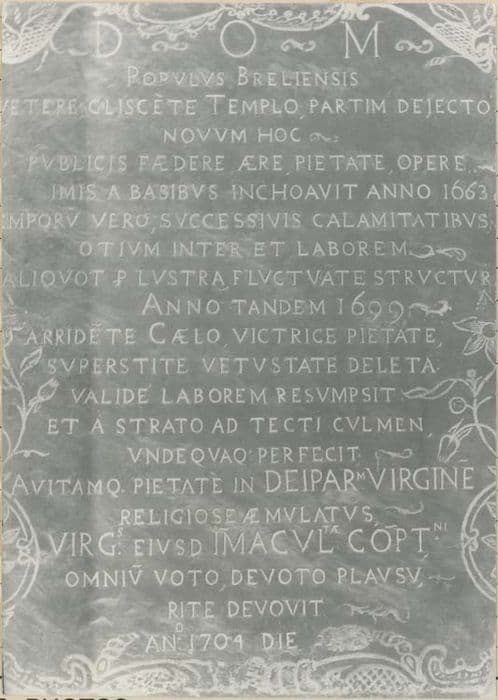 Inscription commémorant la reconstruction de l'église. Ardoise de Ligurie. Le texte figure dans un encadrement à ramages et motifs (volutes, cartouches à fond gauffré).