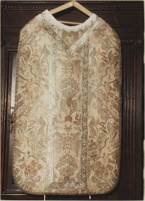 Chasuble. Broché de soie et de fils d'argent. Motifs et végétaux stylisés disposés en gros bouquets et guirlandes, rehaussés de rouge, sur fond rose.