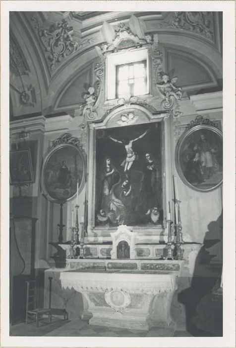 Toile du début du 17e siècle. Autel et retable du 3e quart 18e siècle. Toile attribuée à Marc-Antone Otto, de Roquebrune, peintre du prince Honoré II de Monaco, seigneur de Roquebrune.