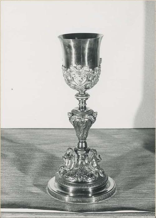 Calice à haut piédouche circulaire de forme hémisphérique portant trois angelots assis, brandissant des instruments de la Passion. Décor de rinceaux. Noeud en balustre décoré de thèmes végétaux (grappes de raisin, épis de blé). Timbale tulipe à gaine ajourée ornée de volutes, d'acanthes et de têtes de chérubins. Etui d'origine en cuir-carton doublé de satin. Le pied est doublé par une coupe ornée en son centre d'une rosace (patène).
