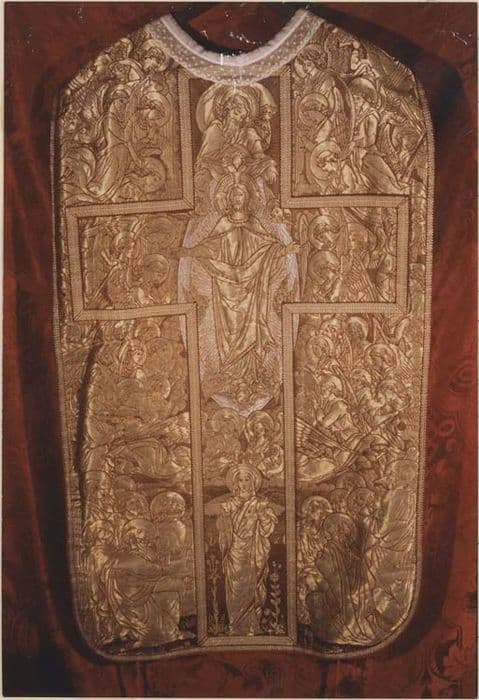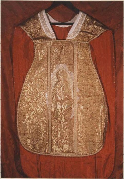 Chasuble avec ses accessoires (quatre pièces). Broché de soie rouge et or. Chasuble romane ou violons ornée au dos d'une croix dans laquelle figure la Sainte Trinité et la Vierge Immaculée entourée d'anges laudateurs ou musiciens. De l'autre face : bandeau central avec Vierge à l'Enfant dans une mandorle, entourée d'anges laudateurs et musiciens. Sur le voile, les mêmes anges entourent l'Agnus Dei rayonnant dans une réserve circulaire. Doublure taffetas rouge.