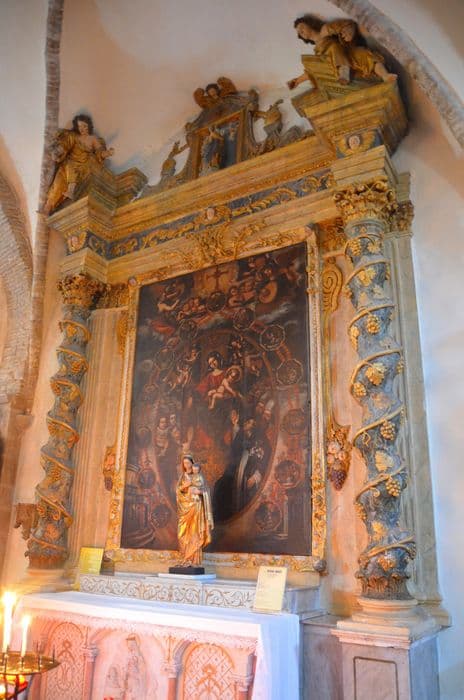 Treize mystères en tout, figurant dans des médaillons octogonaux fixé à un Rosaire à double rangée de perles entourant le médaillon central. Deux médaillons ont peut-être disparu dans la partie inférieure, lors d'un réajustement de la toile dans son encadrement au 17e siècle.