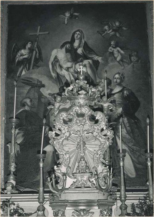 tableau : la Vierge de Pitié, entre les saints Dominique, Nicolas, Lucie et Catherine d'Alexandrie