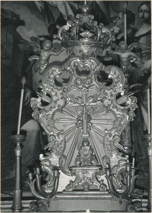 Décor de volutes, feuilles d'acanthe et coquilles, deux angelots tiennent la couronne au sommet.