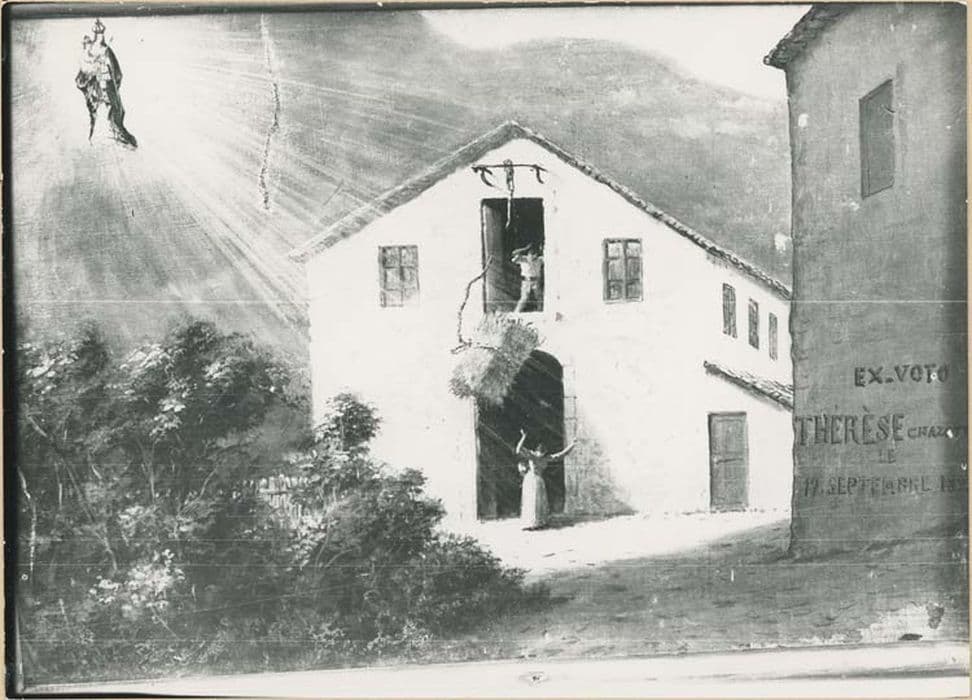 POP | Plateforme ouverte du patrimoinetableau ex-voto : Ballot de foin tombant sur une paysanne