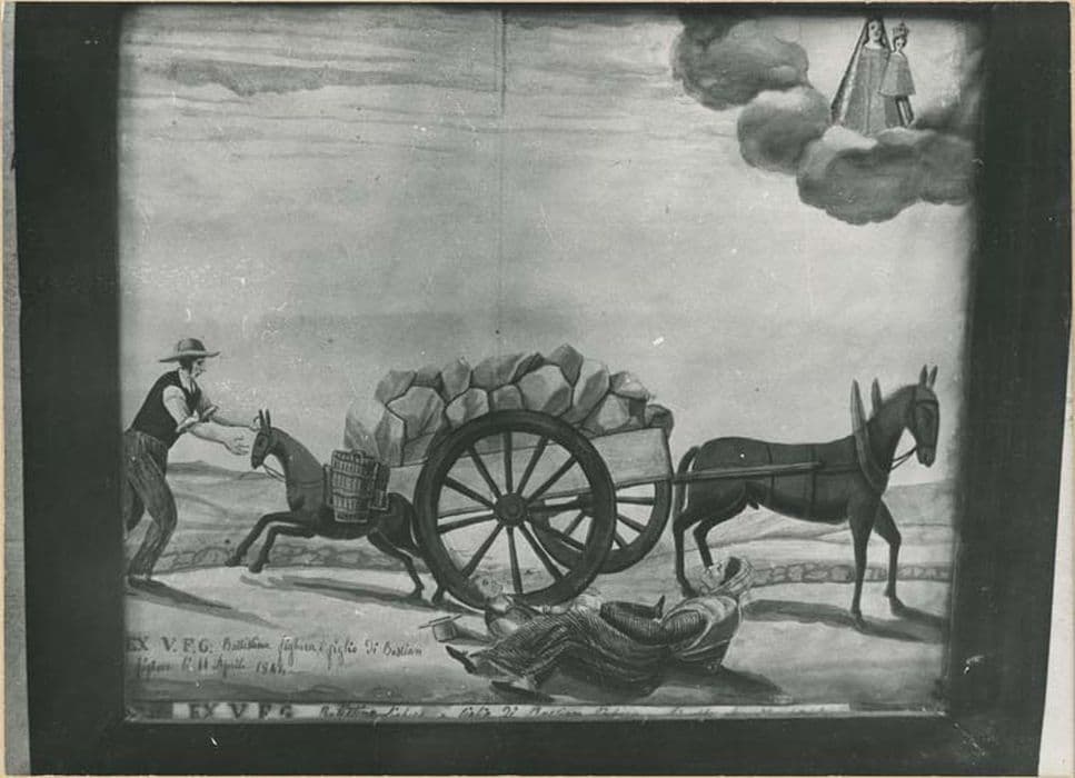 POP | Plateforme ouverte du patrimoinetableau ex-voto : une Femme et un jeune homme renversés par une charrette chargée de pierres