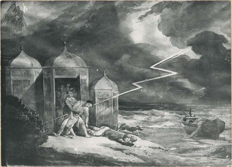 tableau ex-voto : Foudre tombant sur des pêcheurs, à la plage