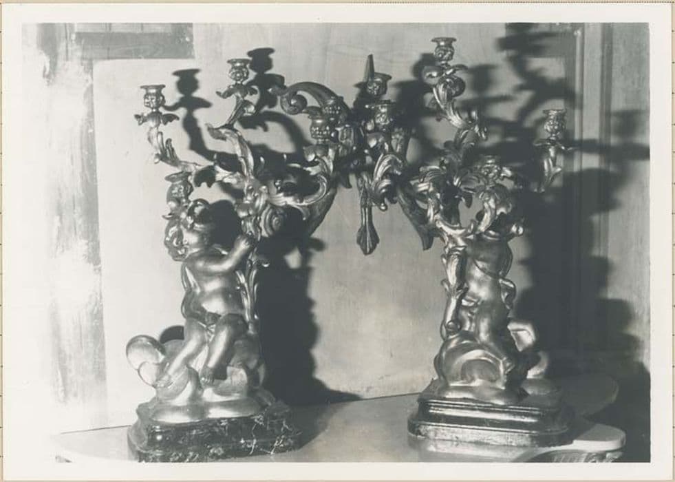 Sculptés sur un socle de section carrée aux angles arrondis. Ils sont à cheval sur un nuage argenté, disposés en symétrie, l'un par rapport à l'autre, portant un candélabre à cinq branches style rococo, traitées dans une manière plus souple que le bois (pâte de bois ou carton-pâte ?).