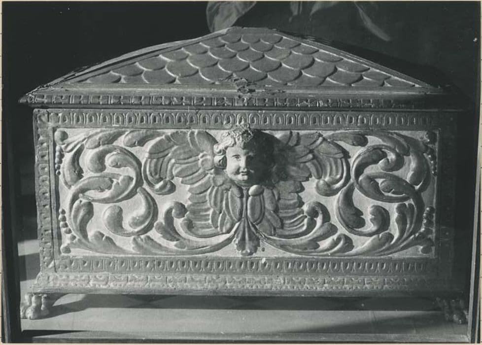 Châsse reliquaire, bois sculpté, rehauts dorés sur fond laqué blanc. Coffret de section rectangulaire reposant sur quatre pattes de lion et couronné par un couvercle pyramidal à quatre faces. Les montants sont ornés de frises de motifs stylisés (feuilles, oves), les faces de rinceaux entourant une tête d'ange, le couvercle de 'tuiles' en écailles de poisson.