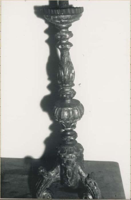 Chandelier tripode (volutes), à socle cylindrique, noeud décoré d'oves et fût en balustre gainé de feuilles.