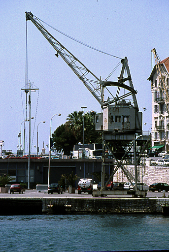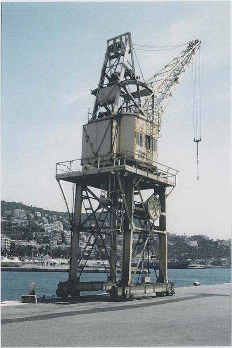 Modèle originel construit en 1937-1938 pour la Chambre de Commerce et d'Industrie de Nice par la société parisienne Applevage. A la fin de la seconde guerre mondiale, an août 1944, des destructions importantes sont causées au port par les Allemands et la grue est avariée parmi d'autres engins. En 1955 la grue Applevage n°14 n'est plus en état de fonctionnement satisfaisant. La société Applevage obtient le marché pour son remplacement : la nouvelle grue est reconstruite sur un modèle trés proche de l'ancien et en faisant une large place à la réutilsation de pièces d'origine.