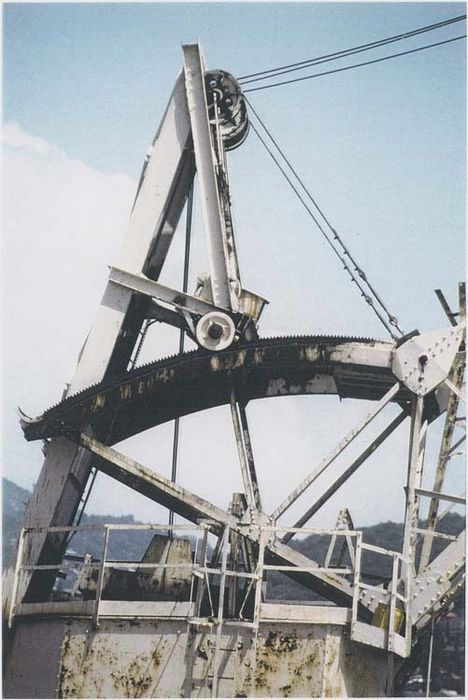 Métal pour la totalité de la machine. Peinture actuelle de couleur jaune, brun-cuivre à l'origine en 1938 d'après les archives. Pontraison en treillis métallique, constitué de profilés en L ou en I boulonnés ou rivetés. Cabines en tôle. Alimentation électrique : 380 volt, triphasé, courant alternatif. Equipement électrique : Alsthom. Quatre moteurs de 70 CV (levage) ; 17 cv (orientation) et 2 fois 10 cv (translation et relevage de la flèche).