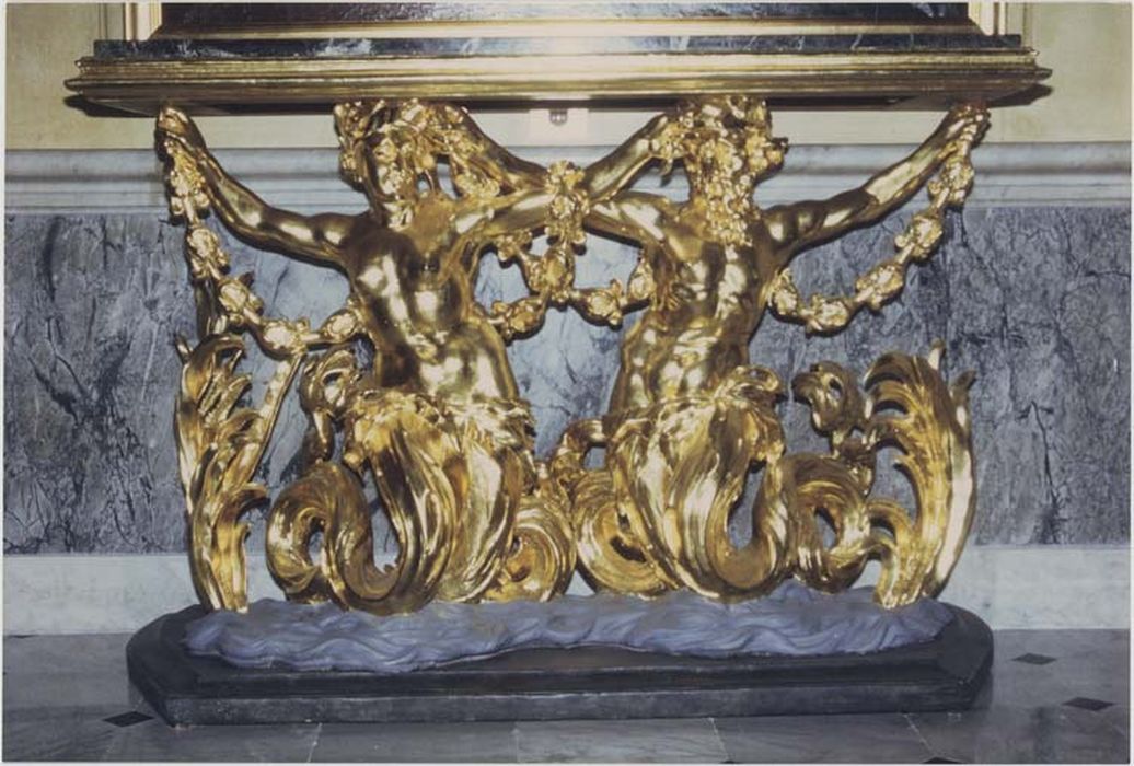 Paire de consoles à couples de tritons et de néréides, en bois sculpté, doré et laqué, à plateau de marbre.