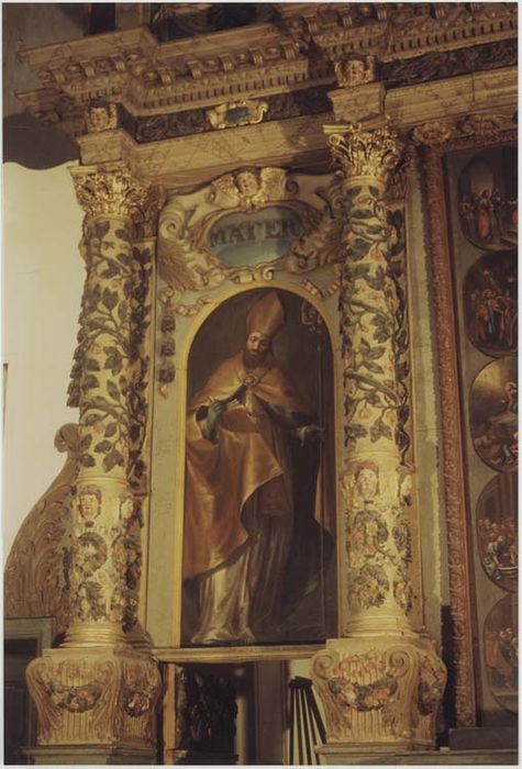 Arrêté : Autel de la chapelle avec son retable à colonnes et ses quatre tableaux : 'descente de Croix' avec 13 scènes de la Passion, 'saint Blaise', 'saint François de Sales', 'couronnement de la Vierge par la Sainte-Trinité', bois polychrome et doré, huile sur toile, XVIIe siècle. Dimensions : H. 680 ; La. 623 ; Pr. 120 cm. avec le cadre. Sur le tableau 'Descente de Croix avec 13 scènes de la Passion', il est inscrit en bas à gauche 'P.1665.R.P.1790' Dimensions : H. 256 ; La. 190 cm. Les 2 toiles 'saint Blaise' et 'saint François de Sales' mesurent H. 170 ; La. 80 cm. Le 'Couronnement de la Vierge par la Sainte-Trinité' mesure H. 120 ; La. 200 cm.