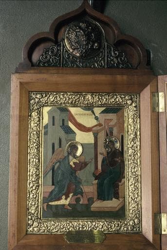 Peinture sur bois, auréoles et bords en argent ciselé, dans coffret vitré en bois clair avec représentation de l'aigle impérial bicéphale dans la partie supérieure avec lutrin de bois sculpté.
