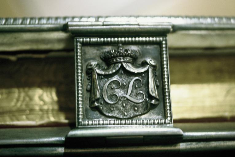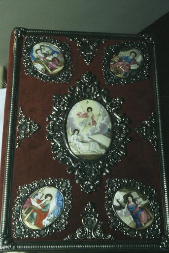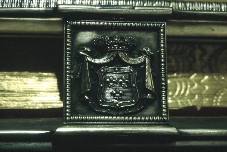 Plat de couverture orné de cinq médaillons en émail encadrés d'argent, figurant le Christ Ressuscité et les quatre évangélistes, sur fond de velours cramoisi, deux fermoirs ornés d'un blason aux trois fleurs de lys et du chiffre CL.