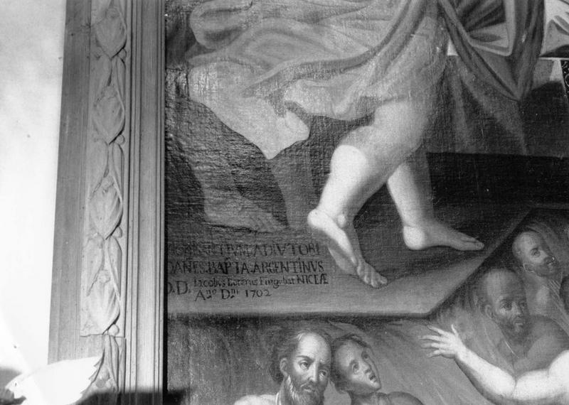 Mort de saint Joseph avec les Ames du Purgatoire d'après le Barroche ? L'inscription fait référence au donateur, le notaire Jean-Baptiste Argentini, notaire à Saint-Etienne de Tinée.