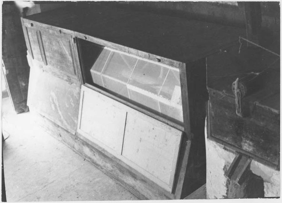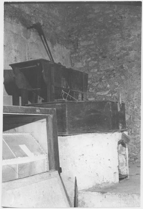 Eléments servant au moulinage des grains : turbine à palettes avec son château d'eau et sa conduite forcée ; les deux meules avec leurs boîtiers et leurs accessoires ; la trémie et le blutoir avec leurs meubles et le bec de transfert de la farine ; les tamis ; quatre pelles et quatre colliers pour remplir les sacs. La turbine est en fer, les meules sont en pierre et les meubles sont en bois.