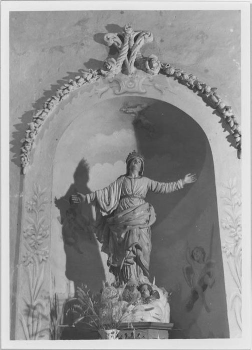 Statue de Vierge de l'Assomption, les deux bras grand ouverts, la tête levée vers le ciel. Le socle se compose de nuées dans lesquelles évoluent des chérubins. Cette statue est en bois peint. Elle est placée dans une niche au décor de gypserie en partie supérieure : guirlandes de fleurs et fruits et monogramme de la Vierge en partie sommitale.