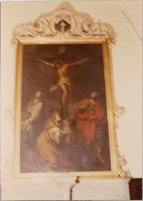 Ce tableau est d'inspiration italienne, produit localement. Il présente le Christ en croix avec sainte Marie-Madeleine agenouillée au pied de la croix, saint Jean-Baptiste et la Vierge, de part et d'autre de la croix. Le cadre, sculpté, est orné d'un fronton de feuillages avec une croix au centre, en médaillon.