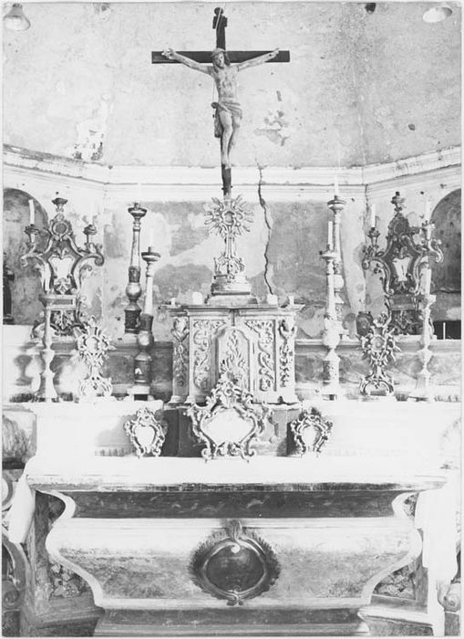 ensemble du maître-autel : exposition, 3 canons d'autel, 4 reliquaires-monstrances, 6 chandeliers