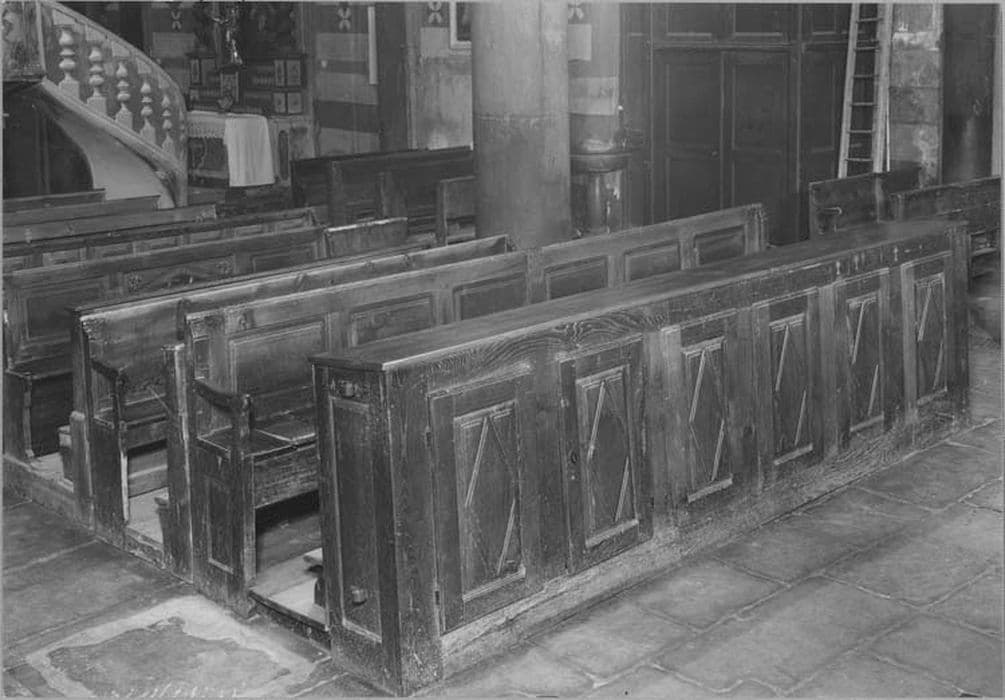Bancs comportant un dossier, un agenouilloir et un pupitre accompagné d'accoudoirs. Les pupitres de ces bancs sont aménagés en placards : six portes par banc. Ces portes sont décorés de panneaux à motifs géométriques : losanges et rectangles.