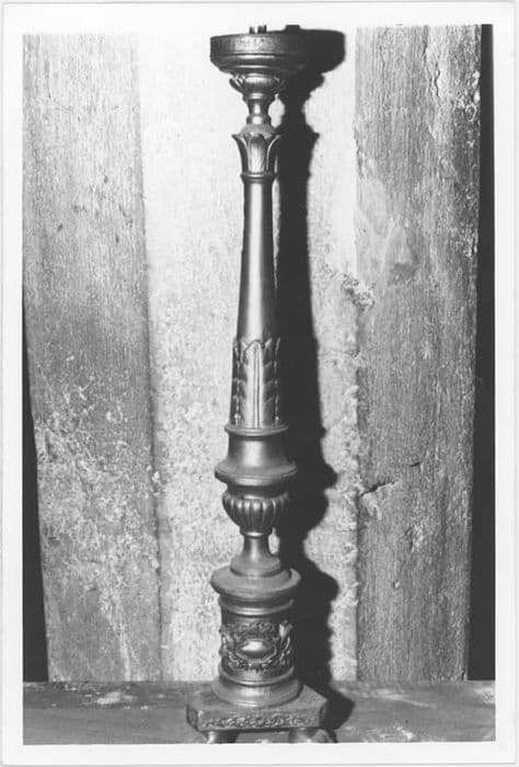 Chandeliers reposant une base triangulaire et trois petits pieds en pattes de lion. La base, cylindrique, est ornée de médaillons - sortes de cuirs découpés. Le fût émerge d'un vase godronné et le fût début par des feuilles stylisées.