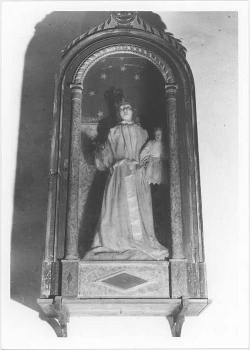 Statue mannequin dont les parties apparentes (tête, mains) sont en cire (moulée). La Vierge est couronnée, comme l'Enfant Jésus elle porte une robe de mousseline blanche à petites broderies mécaniques (points ou étoiles).