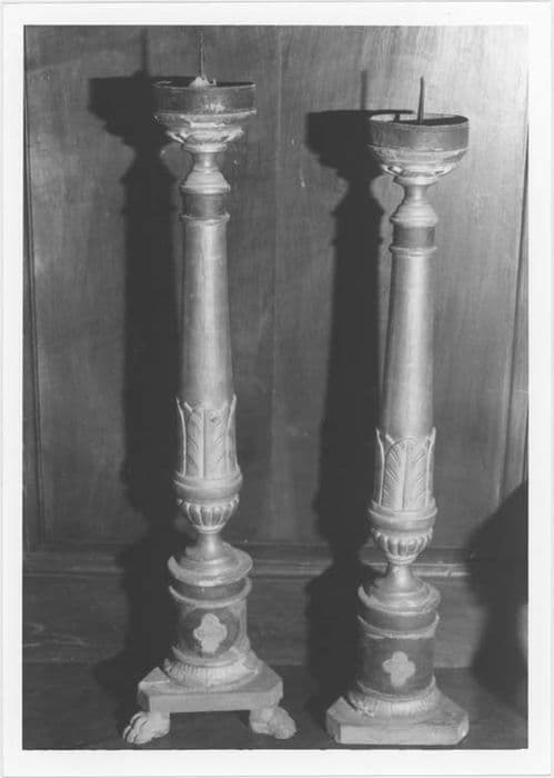 Chandeliers tripodes à socle cylindrique décoré jadis de motifs quatre feuilles en relief. Le noeud, en forme de coupe, à godrons, supporte un fût tronconique gainé de feuilles.