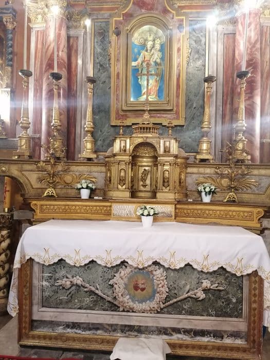 Autel surmonté d'un grand retable classique à colonnes, peintes en faux-marbre, entourant une petite niche et sommé d'un fronton à arc brisé et cartouche central représentant l'agneau pascal, en relief. Le retable est flanqué de deux niches à colonnes torses surmontant deux portes latérales d'accès à l'abside. Il présente trois niches occupées par la statue de la Vierge à l'Enfant en partie centrale, de saint Joseph et de saint Antoine abbé pour les parties latérales.