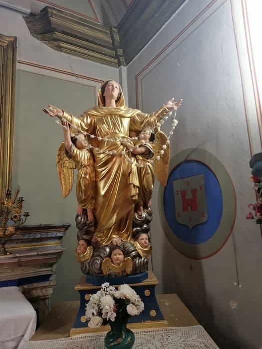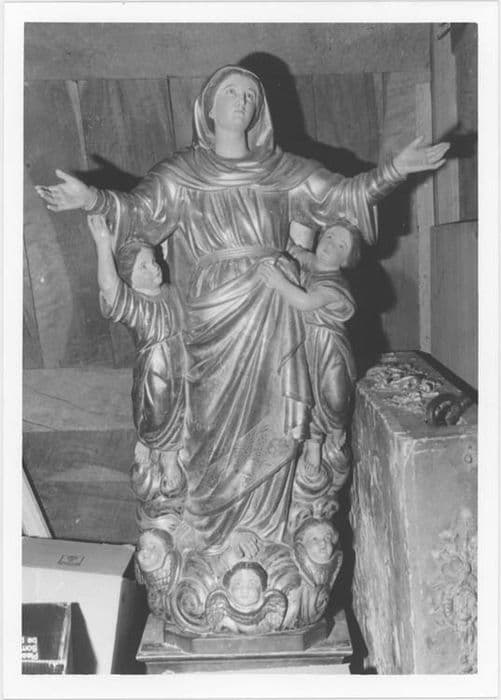 Par sa composition d'ensemble, cette statue rappelle les groupes sculptés aux XVIIe et XVIIIe siècles, inspirés par les Vierge de l'Assomption de l'école de Bologne. Cependant ici, la figure de la Vierge glorieuse, représetnée en pied sur un nuage rehaussé de chérubins, étendant ses bras et fixant le ciel est beaucoup plus figée. Sa tunique, son manteau et le voile recouvrant sa tête sont dorés comme la tunique des putti qui la flanquent, soutenant ses bras.