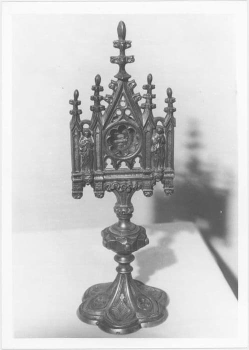 Reliquaire de style troubadour, pédiculé, à socle hexalobé divisé en écoinçons décorés de motifs géométriques (quatre feuilles et losanges). Noeud aplati avec six bossages en pointes de diamant rehaussées à chaque extrémité d'un cabochon. Monstrance néo-gothique en forme de triptyque : au centre le médaillon reliquaire circulaire avec baie polylobée couronnée d'un pinacle ; sur les côtés : effigies de deux saintes ou vertus.