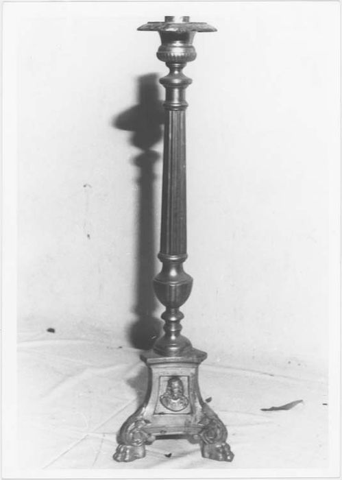 Chandeliers tripodes reposant sur des pattes de lion avec socle pyramidal comportant des effigies (en relief) sur les trois faces : le Christ, la Vierge et saint Joseph. Noeud évasé portant le fût tronconique cannelé. Porte bobèche campaniforme à bords très évasés.