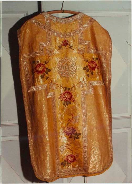 Chasuble en drap d'or avec croix dorsale constituée grâce à un galon doré. A l'intérieur de la croix, des ramages végétaux constitués de feuilles et de grosses fleurs (des roses) et de plus petites fleurs blanches (type jasmin). Au centre de l'orfroi dorsal : le monogramme du Christ dans une couronne d'épines sur fond de gloire rayonnante.