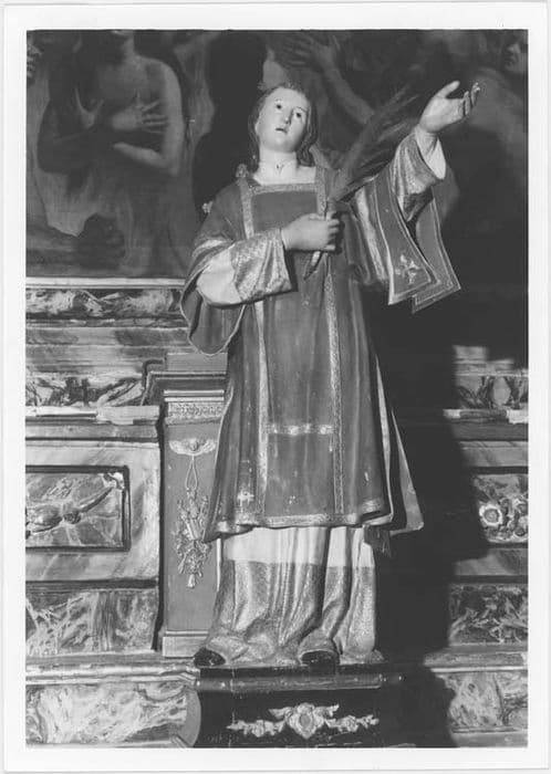 Cette statue a été réalisée avec de la pâte de bois. Saint Antonin est représenté comme un jeune diacre du 19e siècle avec une dalmatique rouge galonnée d'or sur un surplis blanc bordé dans le bas d'une large bande de dentelle. Avec une expression un peu précieuse, il tend son bras gauche vres la droite et tient la palme du martyr dans sa main droite, fixant le ciel d'un regard extatique.