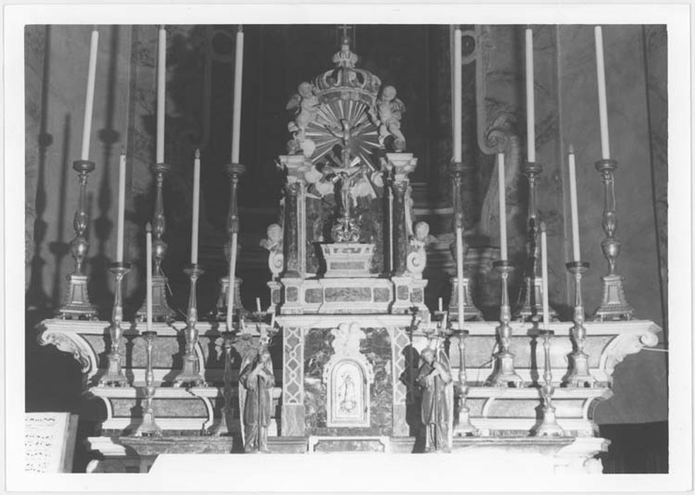 Ensemble de mobilier en bois doré posé sur la table et les gradins du maître-autel. Les quatorze chandeliers se subdivisent en trois paires de grands chandeliers, deux paires de chandeliers moyens et deux paires de petits.