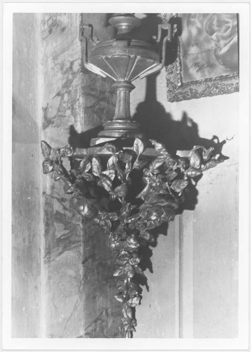 Deux petites encoignures de style rocaille en forme de cul-de-lampe avec partie ajourée, richement ornées de ramages et de fleurs (roses) avec une guirlande constituant la pointe inférieure.