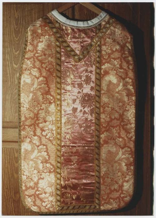 Chasuble composée de trois lés de tissu réunis avec galon or à fleurettes d'argent. La bande centrale est en satin de soie rose avec motifs de ramages végétaux et fleurs or. Les bandes latérales sont un broché de soie imprimé de motifs végétaux stylisés sur fond rose.