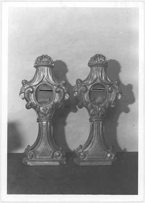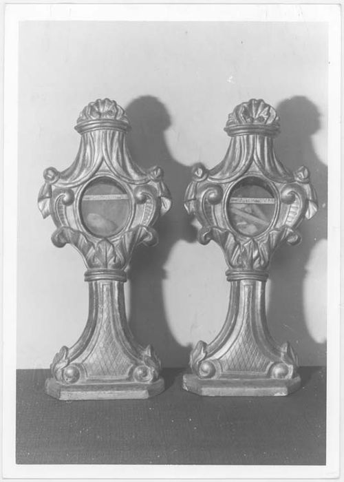 Reliquaires pédiculés à socle pyramidal. Ils ne sont décorés que sur une seule face. Pour quatre d'entre eux, la monstrance, ovoïde, est encadrée d'acanthes et de volute. Elle est surmontée d'un petit dais couronné par une petite coquille. Quatre autres reliquaires possèdent un piètement de pattes de lions, surmonté de deux consoles inversées. La monstrance occupe un cartouche hexagonal encadré de feuilles et surmonté d'une coquille frontale. Deux paires conservent les reliques des saints Justine, Domitille, Pie Ier et Cécile. Deux autres paires conservent les reliques des saints Poplycarpe, Boniface, Siméon et Marcel et une paire conserve les reliques des saints Magne, Gervais et Protais.