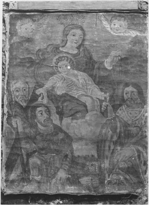 Le roi Louis XIII est agenouillé devant la Vierge à l'Enfant. Il est accompagné de deux autres hommes.