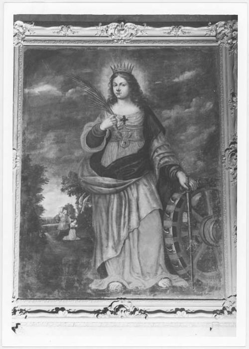 La sainte est debout, couronnée et entourée de ses attributs : palme du martyre, roue et épée. La scène de sa décollation est représentée au fond à gauche dans un paysage bucolique.